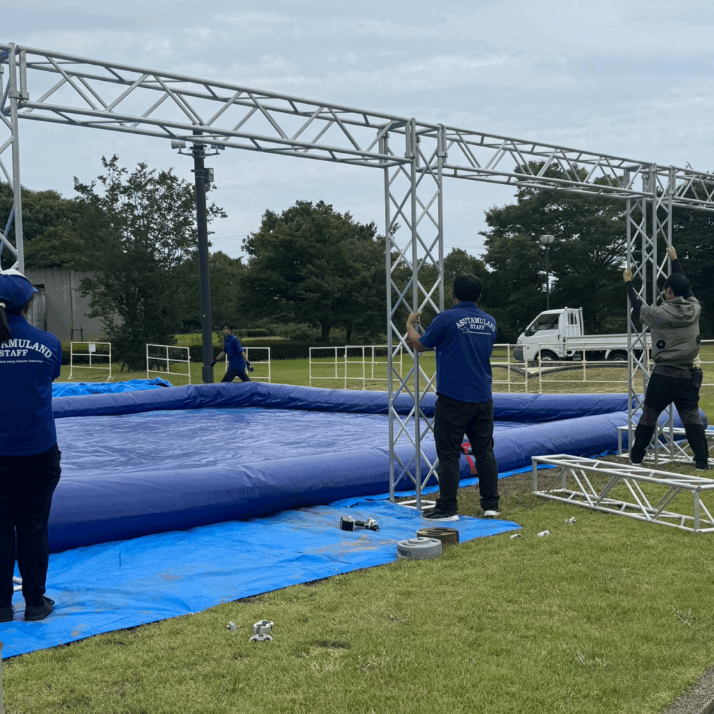 炎天下の中、スタッフたちは声を掛け合いながら、一つひとつ地道に組み上げていきました。